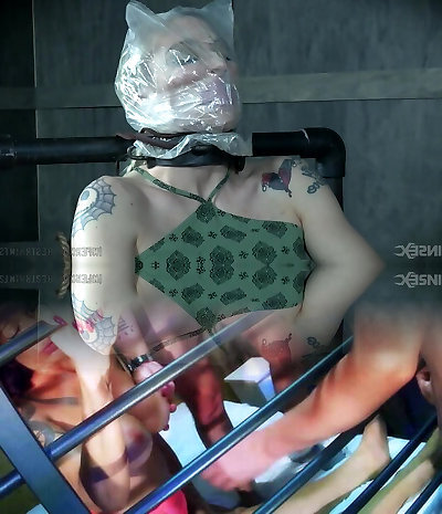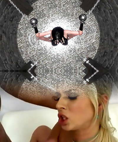 Kinky blond stunner got chained and forced to cum and eat jizz, at the same time