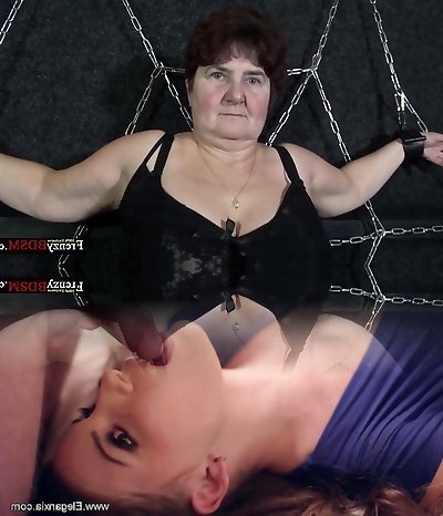 Shackled chubby grandmother Hana gives a blowjob standing on her knees