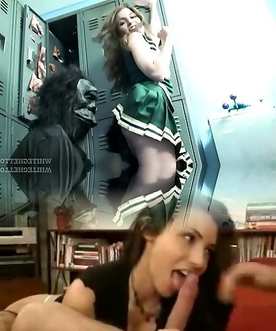 Naughty cheerleader kicks dude in a jokey costume in his balls