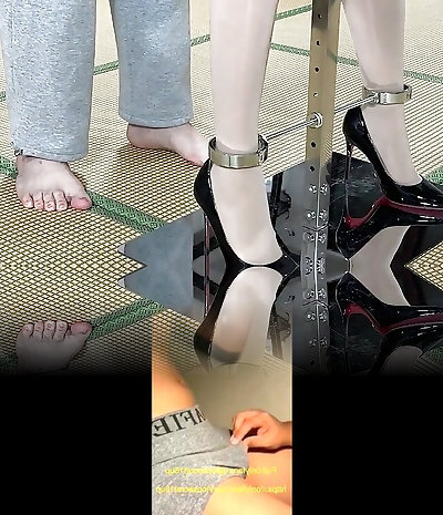 High heels CFNM dominatrix in lingerie plunges heel in sub cock