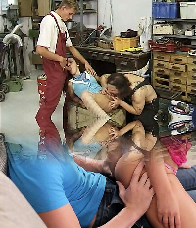 Light-haired degenarte submissivae slut get rough fucked and hard dominated by lesbo group in basement.