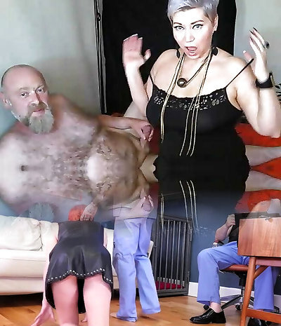 A bald, bearded and furry male is violent to his beautiful mature wife for the amusement of people))
