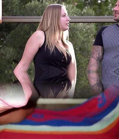 Perverted married couple fucks pretty light-haired teen with pigtails
