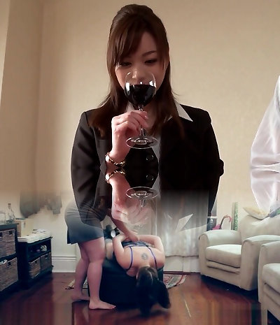 Tied up with a corset, I deep-throat a rich cock while they masturbate my wet pussy