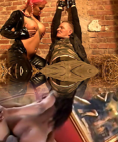 Filthy Busty Redhead Has Fun With a Submissive Shackled Guy, Kicking His Balls And Teasing His Dick