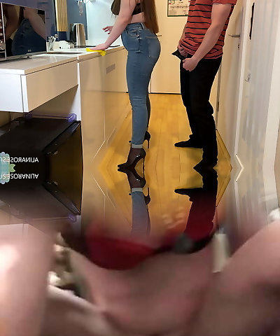 Step-mom pulled down her jeans so I can jerk off and cum on her pantyhose donk