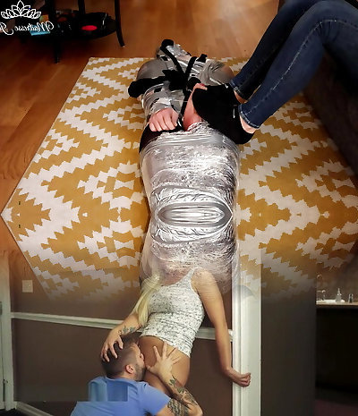 Mesmerizing towheaded hottie gets her legs locked in shackles and her face covered with her panties