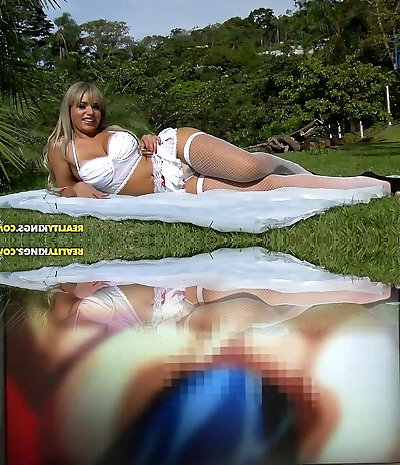 Laura is wearing a sexy white dress, pinkish pantyhose and platform heels, tied up and gagged in a bed